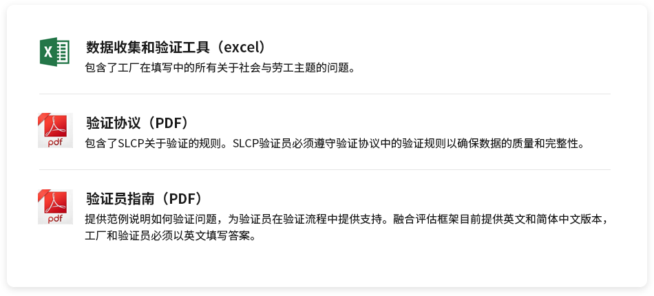 在SLCP的情形下開(kāi)發(fā),旨在支持利益相關(guān)方改善全球服裝和鞋類(lèi)供應鏈工作條件。由數據收集工具,驗證協(xié)議和驗證員指南組成。