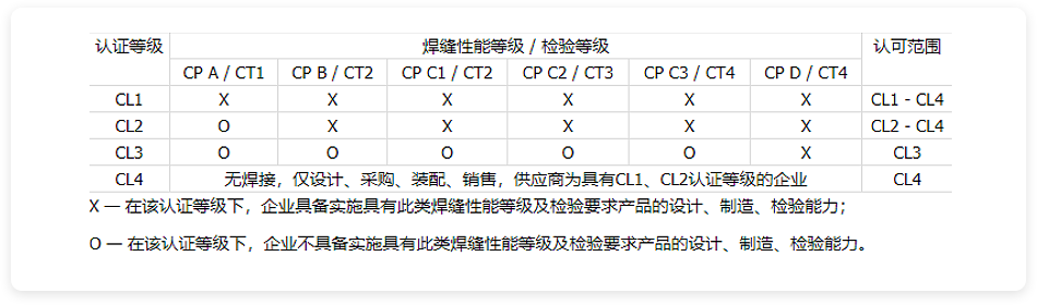 認證級別取決于公司的生產(chǎn)能力和焊縫性能等級(CPA-CPD)。具體的分類(lèi)詳情見(jiàn)下表: